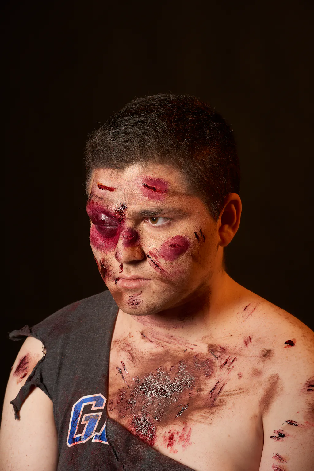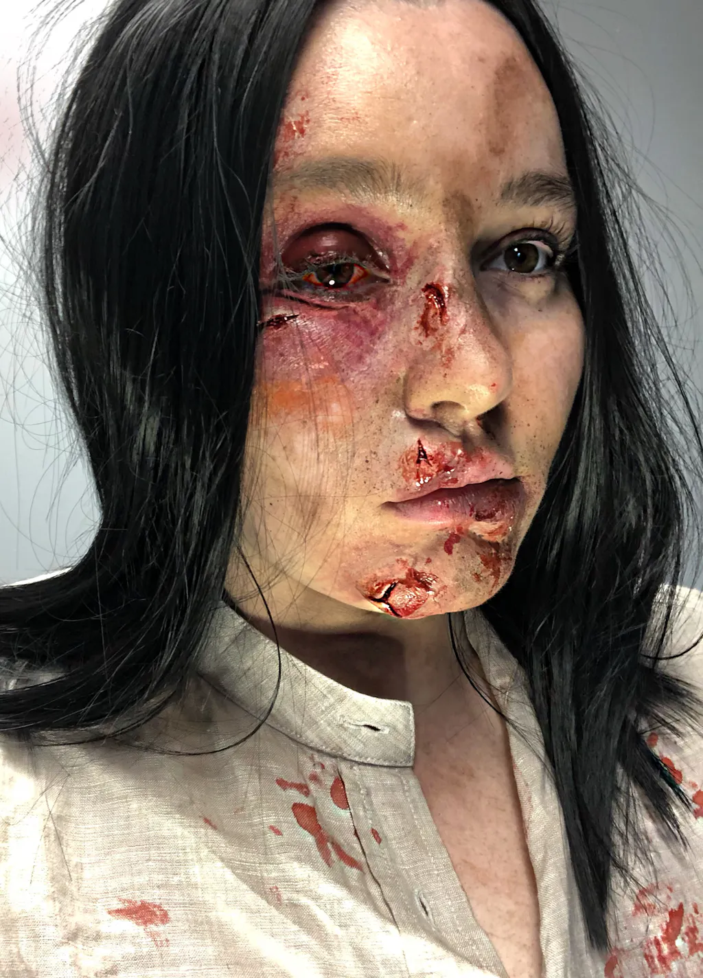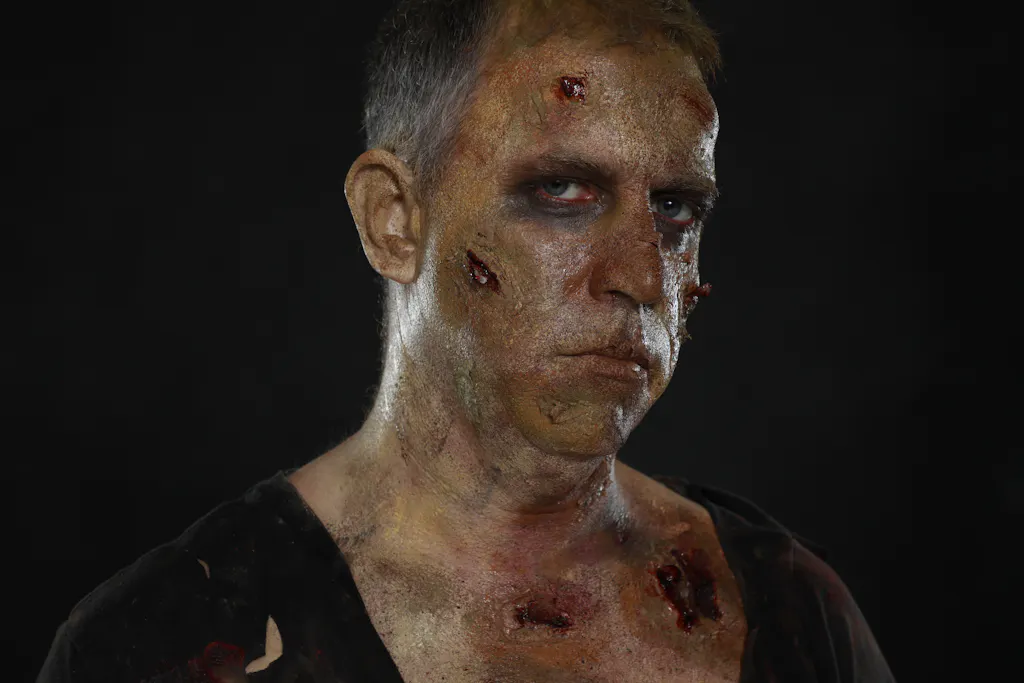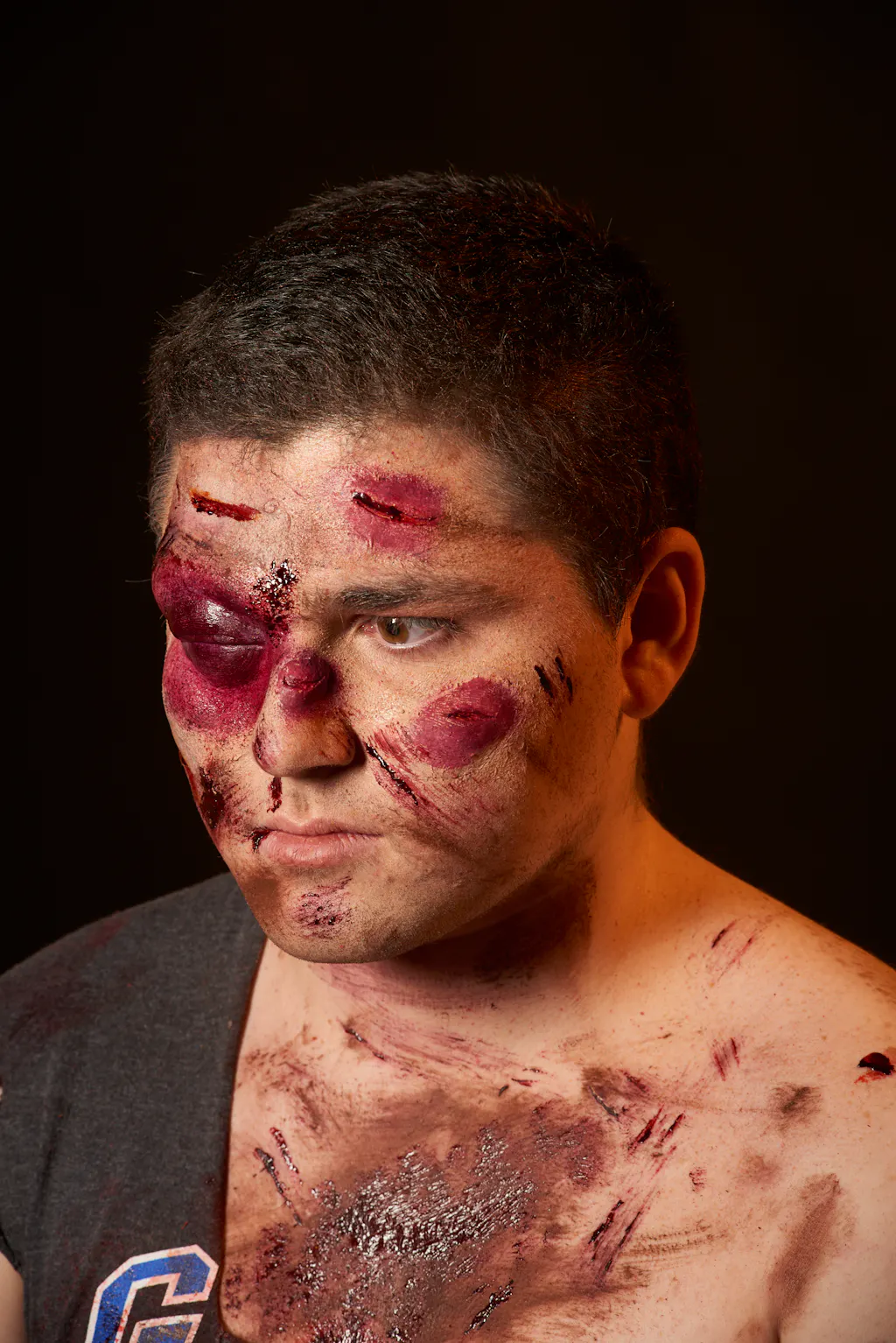 If you need to look like you got your face smashed this will do the trick. Includes 10 face injury pieces. Shown here with removable flashing. By the way, if you think this looks bad, you should see the other guy.