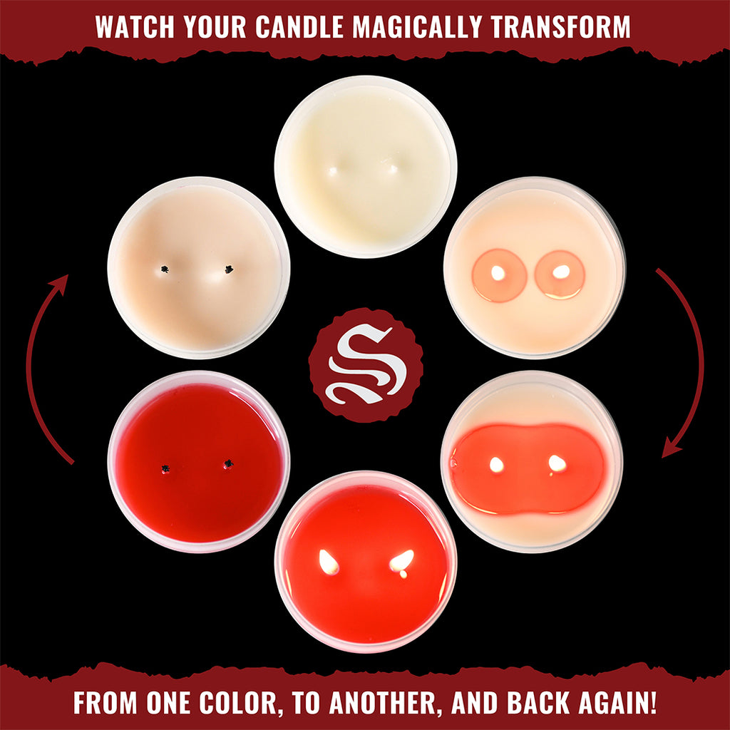 Ready for a bloody, magical experience? Right before your eyes, watch the slow metamorphosis as these candles start out as bone, pool to black or blood-red when lit, and turn back to bone as they cool. As the candle burns, the room fills with an enchanting scent...