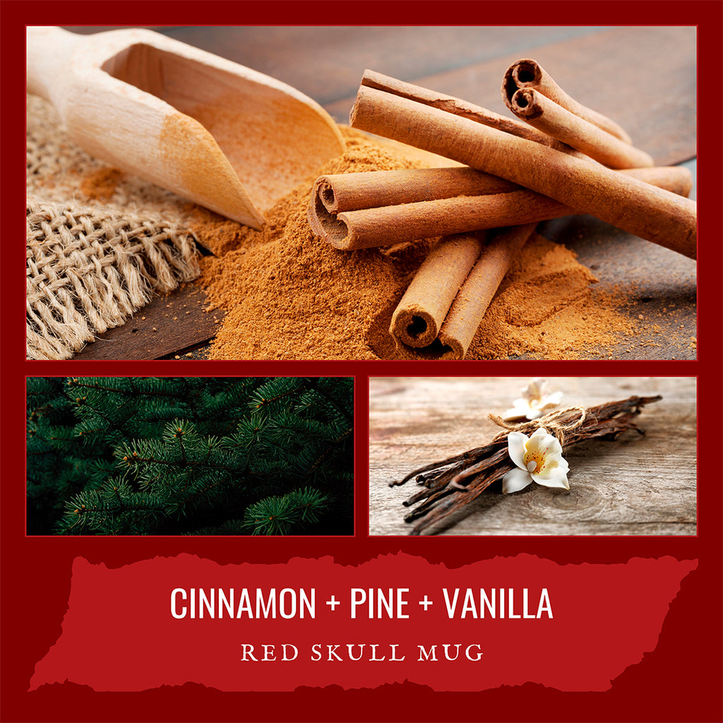 - Spectre Red Skull Mug Candle that pools from bone to blood red when lit and back to bone when cool, while filling the room with cinnamon, pine and vanilla.