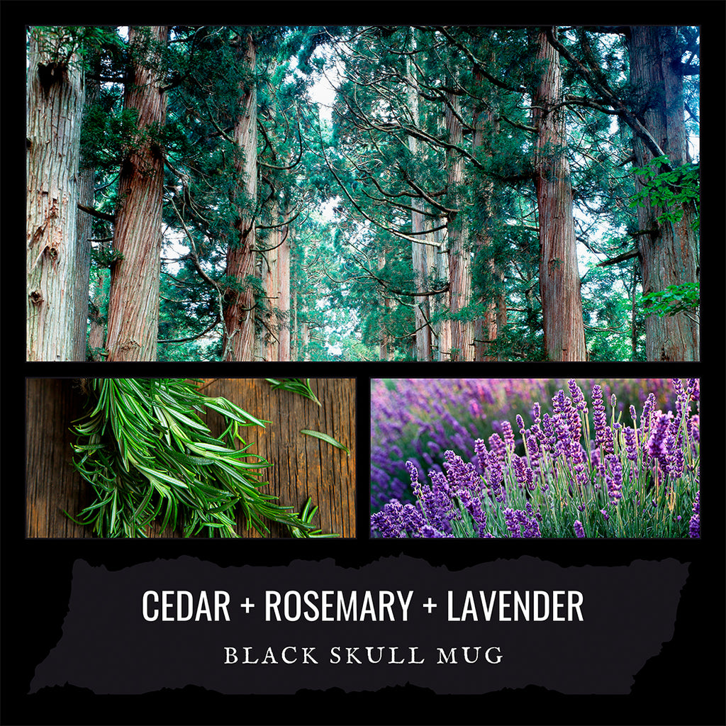 - Spectre Black Skull Mug Candle that pools from bone to an eerie black when lit and back to bone when cool, while filling the room with cedar, rosemary and lavender.