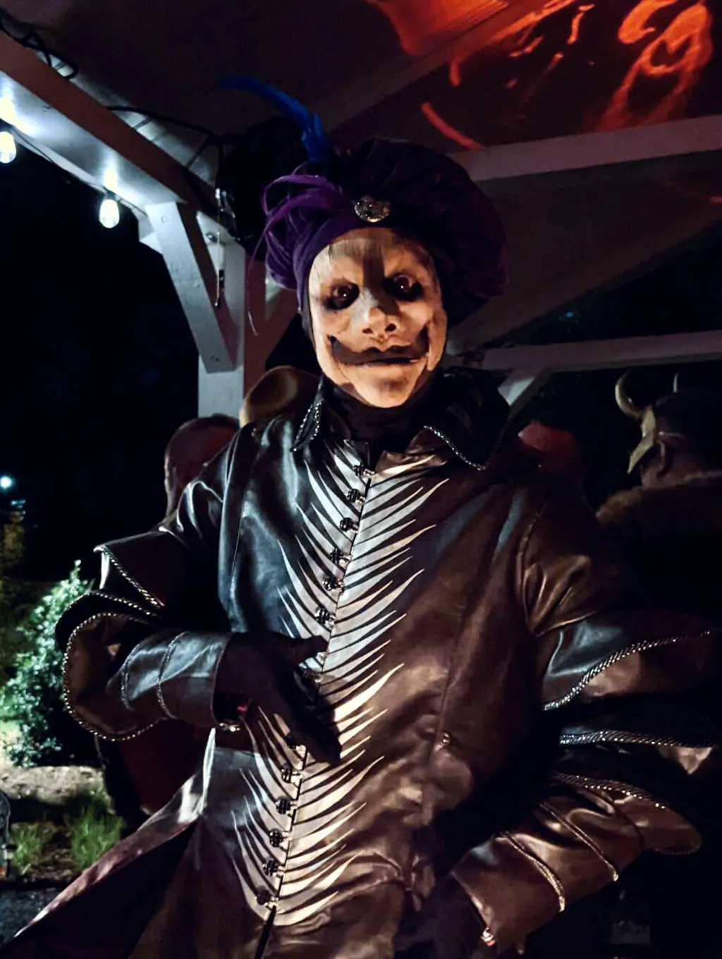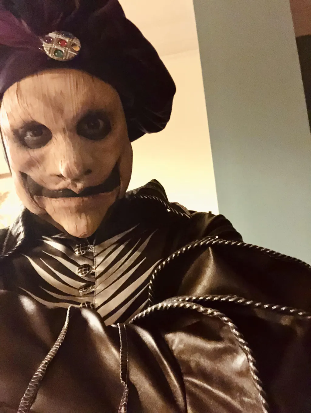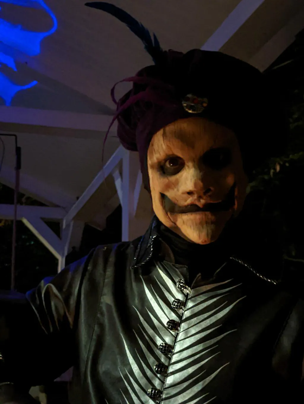 Not a happy ventriloquist dummy mask here. Long nose, wood grain texture and a knot at the tip of the chin.