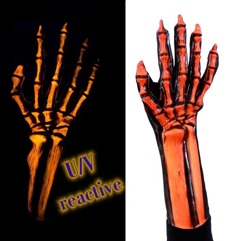 Skeleton costume gloves are a dramatic and fun effect comfortable enough to wear all night. Use a pair of these gloves to help round out any UV reactive costume or mask with that final TOUCH!